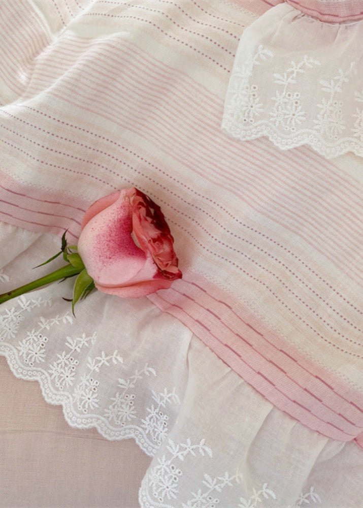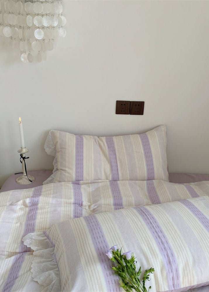 Cecilia Lace Ruffle Double Gauze Striped Bedding Set is now offered in a bundle, and all bundle sets come with a pre-included 10% to 20% discount! Enjoy savings on a complete set, including a duvet insert and pillow(s), along with our classic duvet cover, bed sheet, and pillowcase(s).