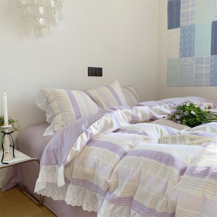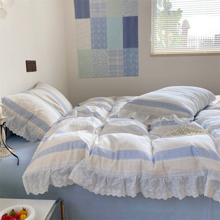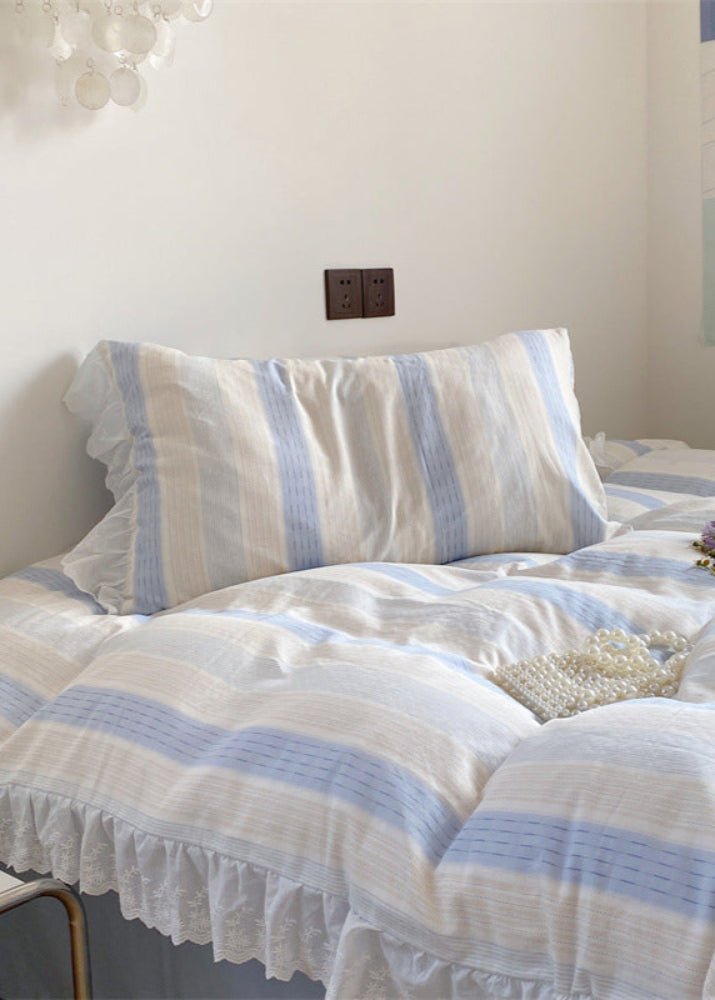 Cecilia Lace Ruffle Double Gauze Striped Bedding Set / Blue