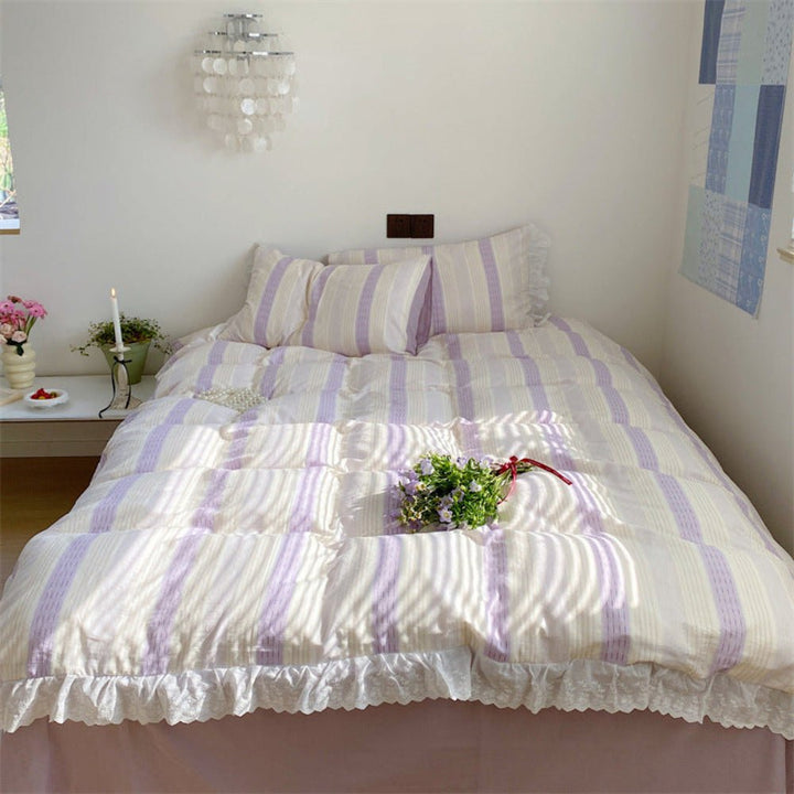 Create a peaceful sanctuary with the Cecilia Lace Ruffle Double Gauze Striped Bedding Set by Ever Lasting. Crafted from soft double gauze with delicate lace ruffles and understated stripes, this bedding offers a serene and quiet aesthetic for your bedroom. The duvet cover features corner ties and a hidden zipper to keep your bedding neat and secure.