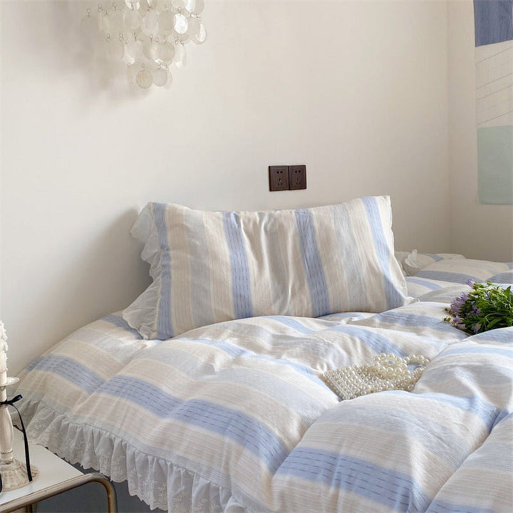 Transform your bedroom into an elegant sanctuary with the Cecilia Lace Ruffle Double Gauze Striped Bedding Set by Ever Lasting. Crafted from ultra-soft double gauze fabric, this bedding features delicate lace ruffles and chic striped patterns that add a touch of sophistication and texture to your space. The luxurious, breathable fabric ensures a restful night's sleep, while the subtle design evokes a timeless charm. Ideal for creating a serene, luxe atmosphere, this bedding set is perfect for those who appreciate refined style. Shop now and indulge in the ultimate in cozy luxury.