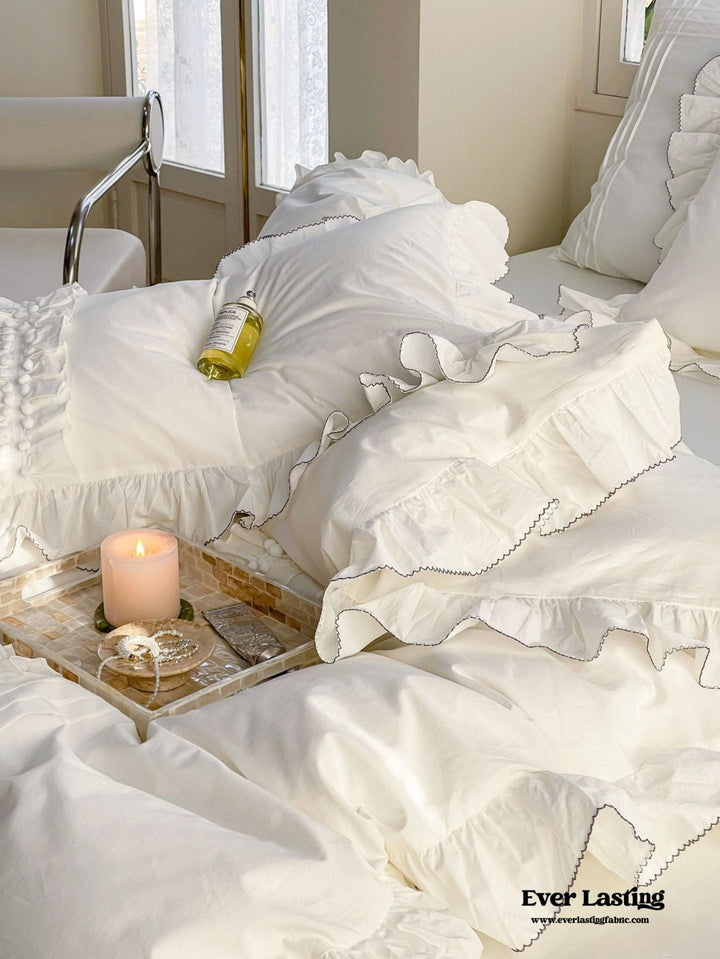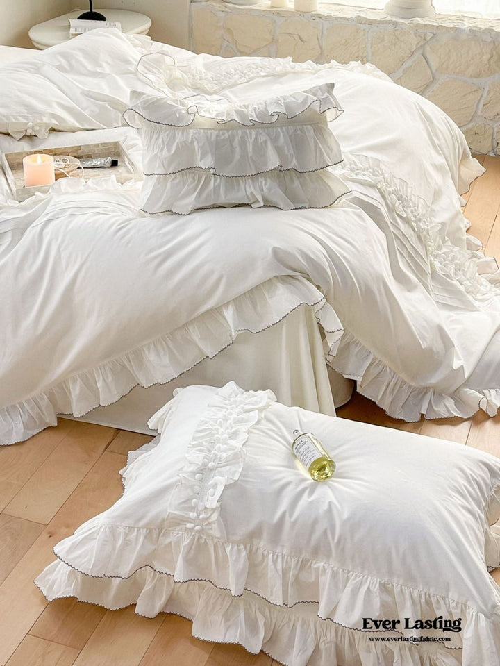 Elevate your bedroom to a tranquil sanctuary with the Clémence French Cottage Lace Bedding Bundle by Ever Lasting. Made of 100% washed cotton, this luxurious bundle combines plush comfort and vintage charm. Delicate lace detailing and romantic ruffle accents create a coquette-inspired, French cottage aesthetic, perfect for a cozy and refined ambiance. The duvet cover is equipped with corner ties and a hidden zipper closure for a secure fit and seamless appearance. Timeless in both design and functionality, this bedding bundle adds a touch of romance and sophistication to any space. Whether you prefer classic femininity or modern cottagecore elegance, the Clémence French Cottage Lace Bedding Bundle is the perfect addition to your home.