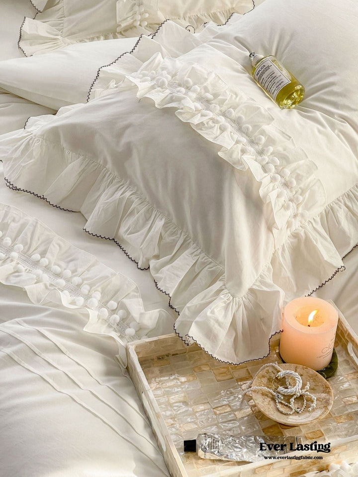 Transform your bedroom into a dreamy retreat with Ever Lasting's Clémence French Cottage Lace Bedding Set. Crafted from soft, breathable 100% washed cotton, this exquisite set offers a luxurious blend of comfort and vintage charm. The delicate lace trim and romantic ruffle accents evoke a coquette-inspired, French cottage aesthetic, perfect for creating a cozy and elegant ambiance. Each duvet cover features corner ties and a hidden zipper closure, ensuring your duvet insert stays securely in place while maintaining a seamless look. Designed for both beauty and functionality, this bedding set enhances your space with its timeless appeal and enduring quality. Whether you embrace classic femininity or modern cottagecore elegance, the Clémence French Cottage Lace Bedding Set adds a touch of romance and sophistication to your home.