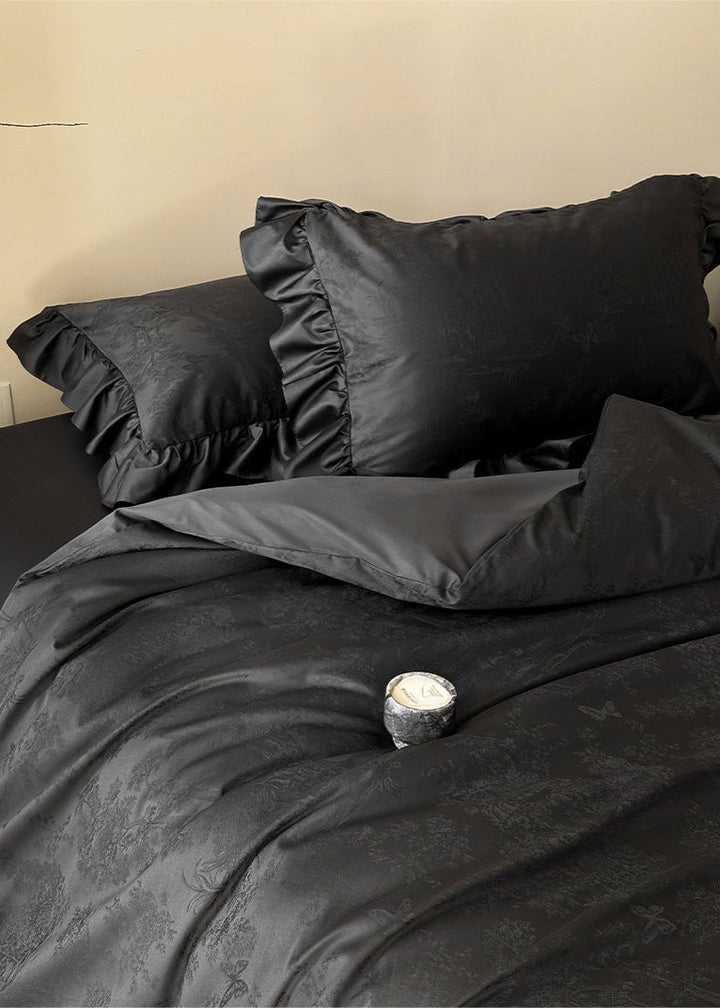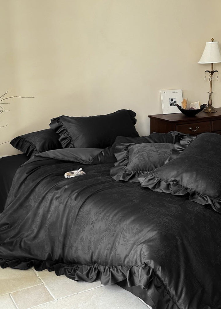 Turn your bedroom into a romantic retreat with Ever Lasting's Elise French Lace Jacquard Satin Bedding Set. Crafted from smooth, luminous satin and detailed with ornate French lace, this set blends softness with timeless sophistication. The jacquard weave adds subtle texture and visual depth, while refined finishes like corner ties and a hidden zipper ensure a secure, polished look. Designed for those who appreciate elegance in every detail, Elise brings graceful beauty to your everyday rest.