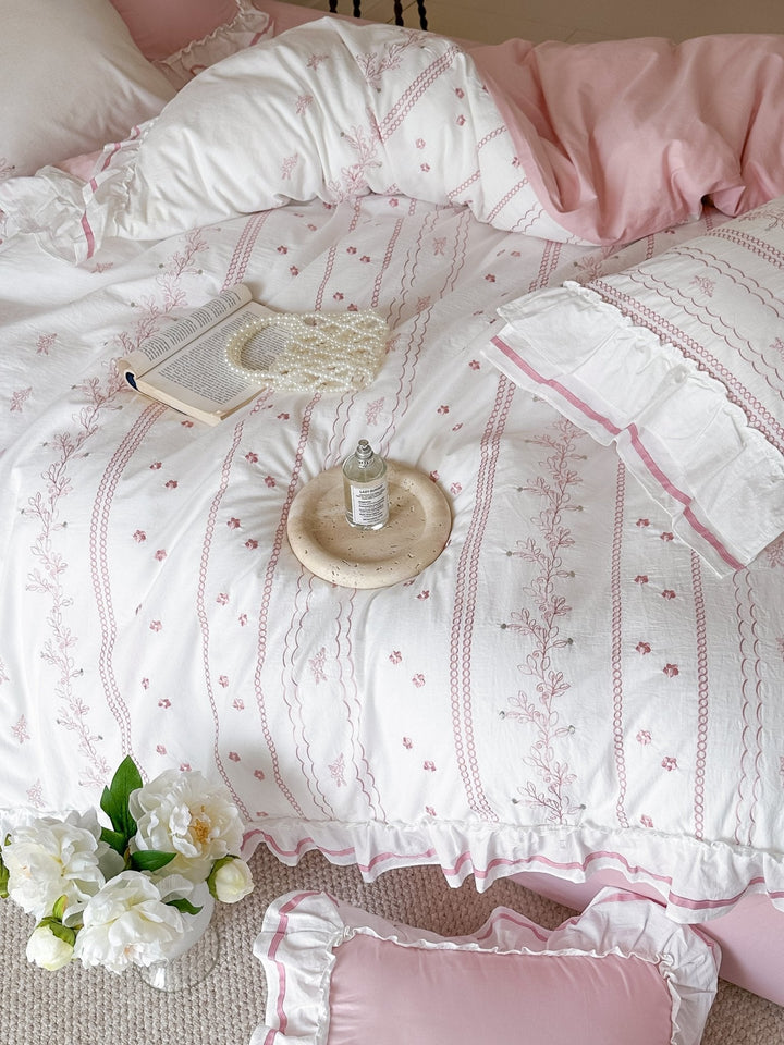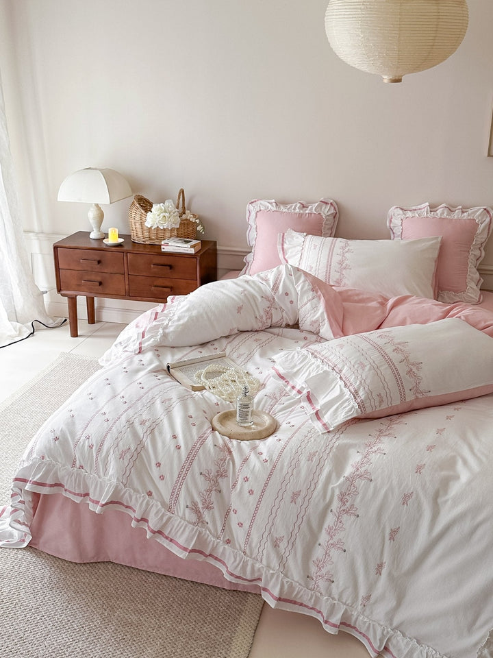 Embroidered French Lace Ruffle Bedding Bundle / Pink