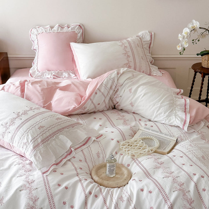 Embroidered French Lace Ruffle Bedding Set is now offered in a bundle, and all bundle sets come with a pre-included 10% to 20% discount! Enjoy savings on a complete set, including a duvet insert and pillow(s), along with our classic duvet cover, bed sheet, and pillowcase(s).