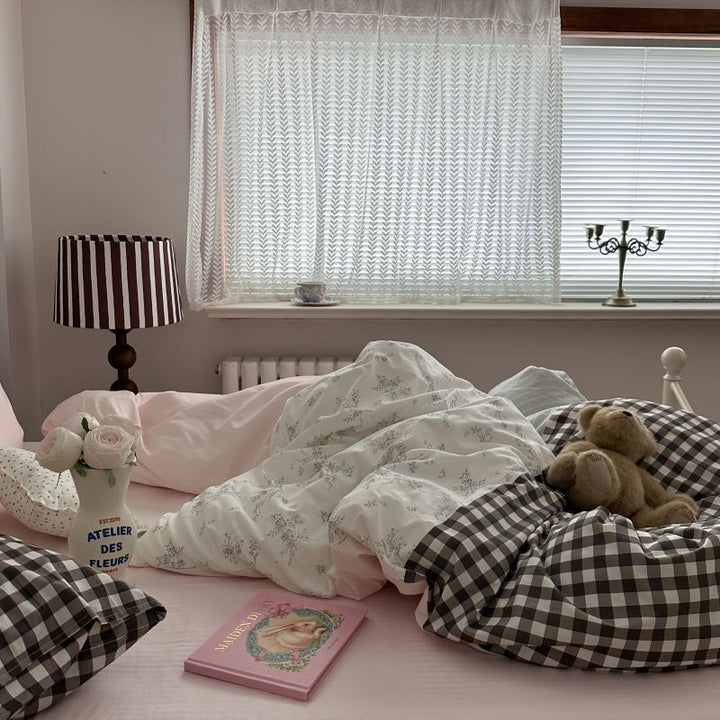 Add a playful charm to your space with the Emi Patchwork Cotton Bedding Set from Ever Lasting. Featuring a cozy mix of warm mocha gingham, soft cloud pink, and sandy neutrals, this set brings a Korean-inspired balance of simplicity and sweetness to any bedroom or dorm.
