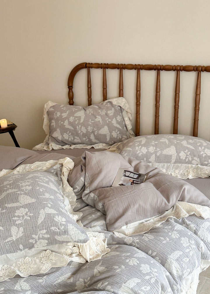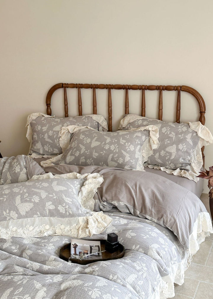 Emmeline Lace Ruffle Floral Bedding Set is now offered in a bundle, and all bundle sets come with a pre-included 10% to 20% discount! Enjoy savings on a complete set, including a duvet insert and pillow(s), along with our classic duvet cover, bed sheet, and pillowcase(s).