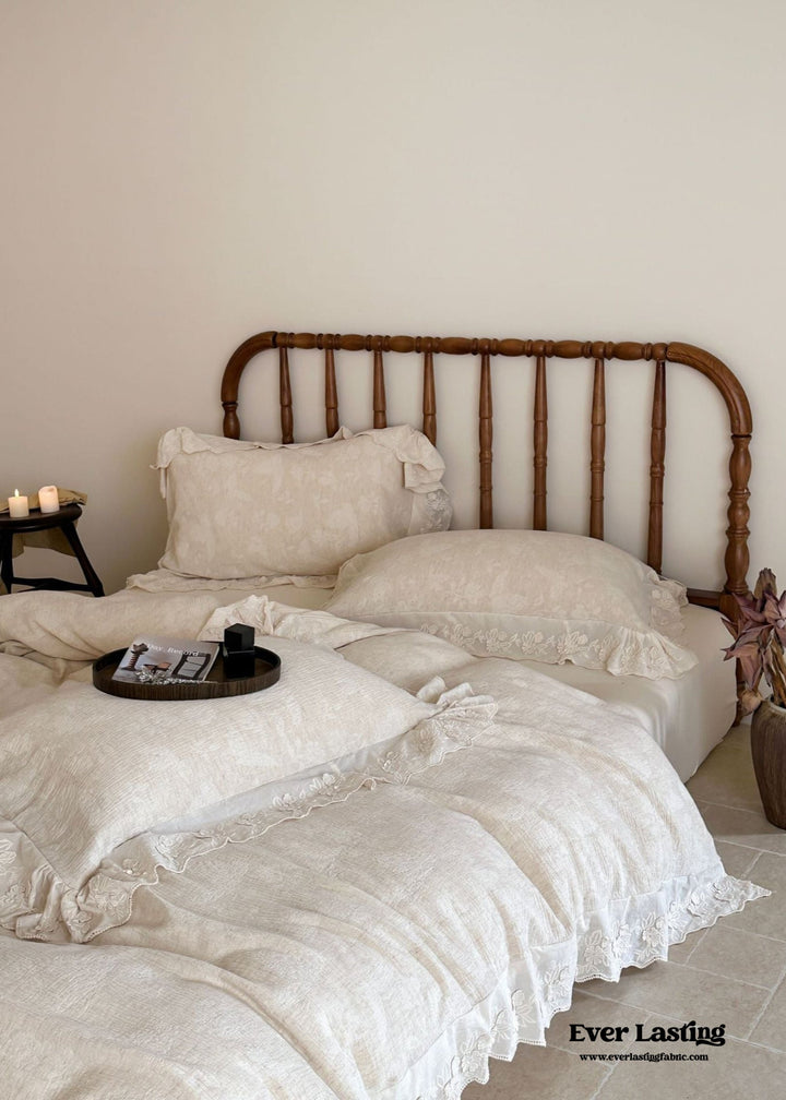 Bring timeless elegance to your bedroom with the Emmeline Lace Ruffle Floral Bedding Set by Ever Lasting. Delicate lace trim, soft ruffle edges, and a vintage-inspired floral print come together in perfect harmony to create a romantic, refined look. Made from soft, breathable fabric for all-night comfort, this set adds charm and sophistication to any space. Finished with a hidden zipper and corner ties to keep your duvet in place—beauty meets function in every detail.