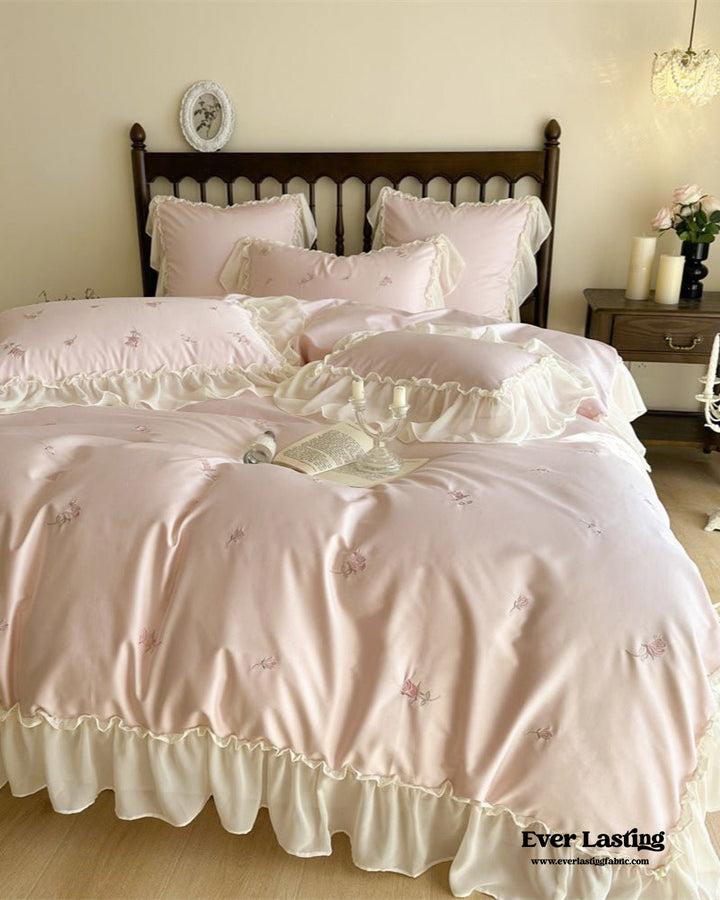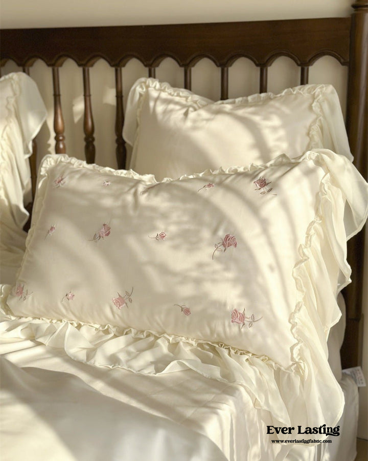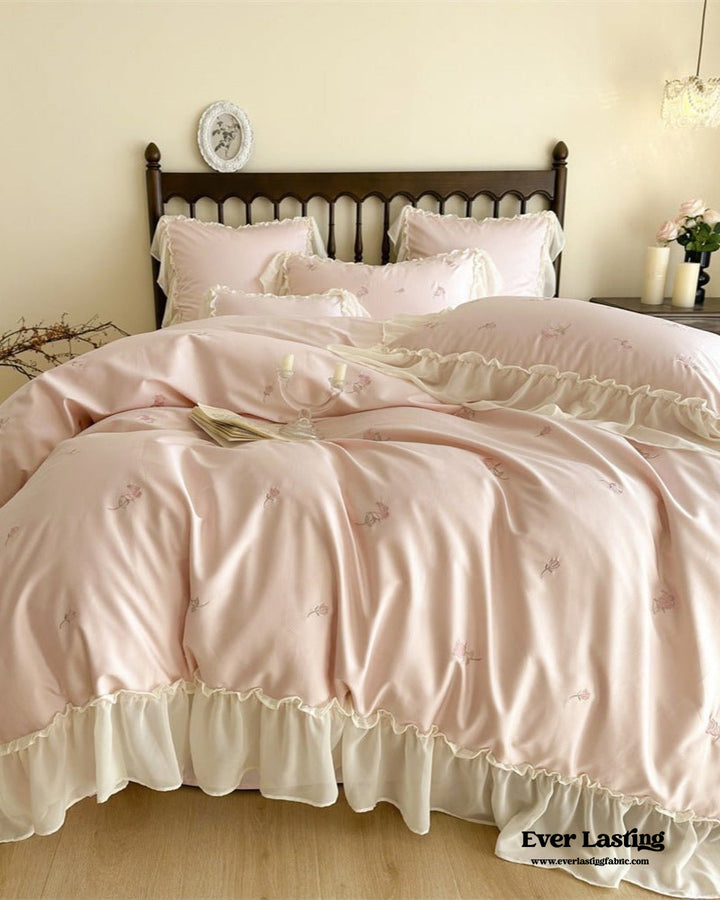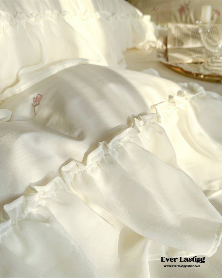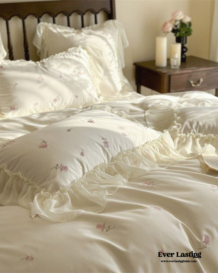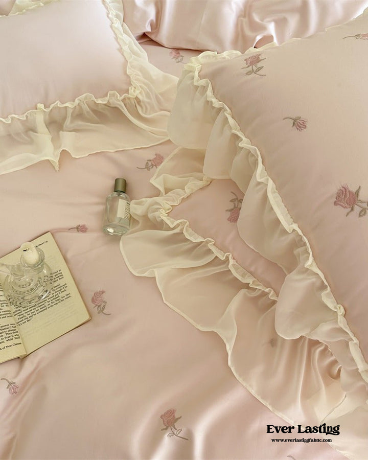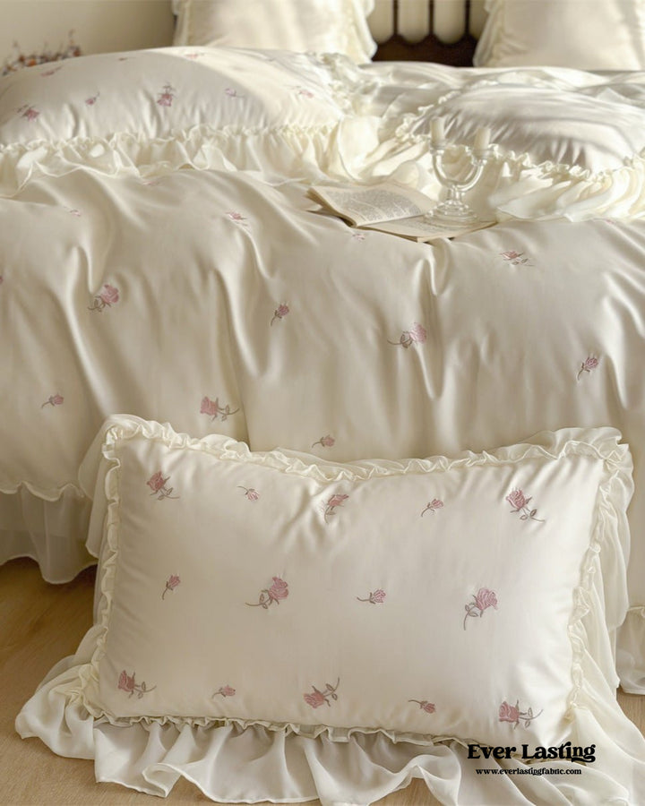 Elevate your bedroom with the timeless elegance of the Rosalie Bedding Bundle from Ever Lasting. Made from buttery long-staple cotton and adorned with embroidered pink rosebuds and chiffon ruffles, this set exudes pure romance. Crafted from extra-long cotton fibers, Rosalie boasts a naturally smooth and breathable feel with a subtle luster. Delicate floral stitching adorns the duvet and pillows, evoking a whimsical and airy feel, while the ruffled trim adds a touch of softness to every detail. Perfect for a cozy cottage, coquette room, or vintage-inspired home.