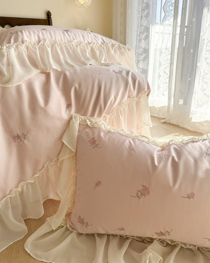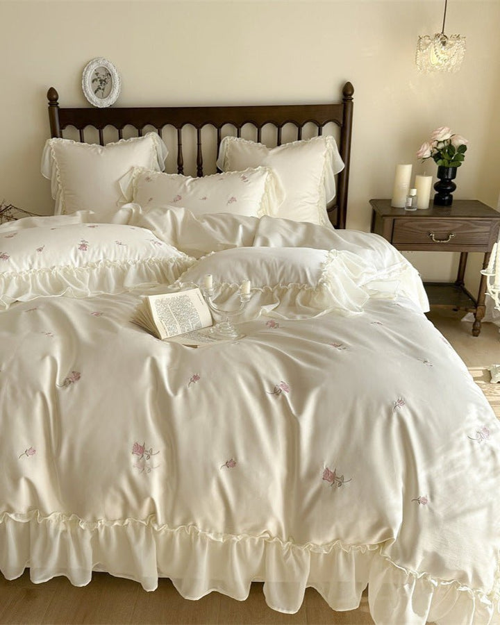 Experience pure romance with the Rosalie Bedding Set from Ever Lasting. Crafted from luxurious long-staple cotton, this set features embroidered pink rosebuds and flowing chiffon ruffles. Its extra-long cotton fibers create a naturally smooth and breathable fabric with a subtle luster. Delicate floral stitching is scattered across the duvet and pillows, reminiscent of petals on a gentle breeze. The charming ruffled trim adds a touch of softness to any bedroom. Perfectly suited for a cozy cottage, charming coquette room, or vintage-inspired home.
