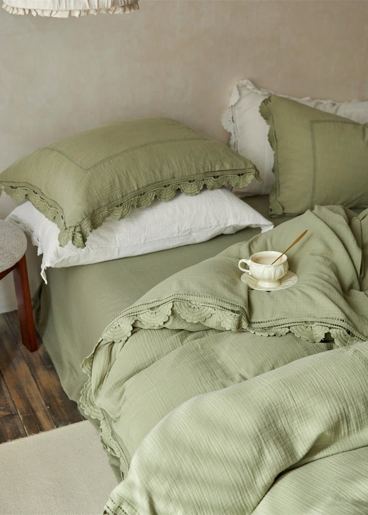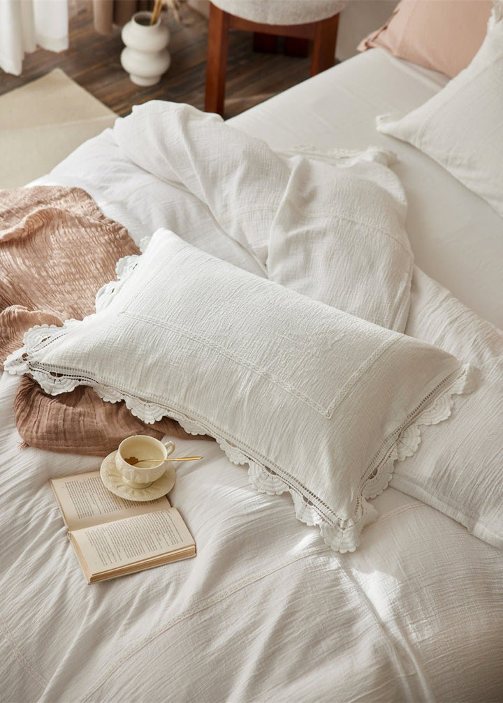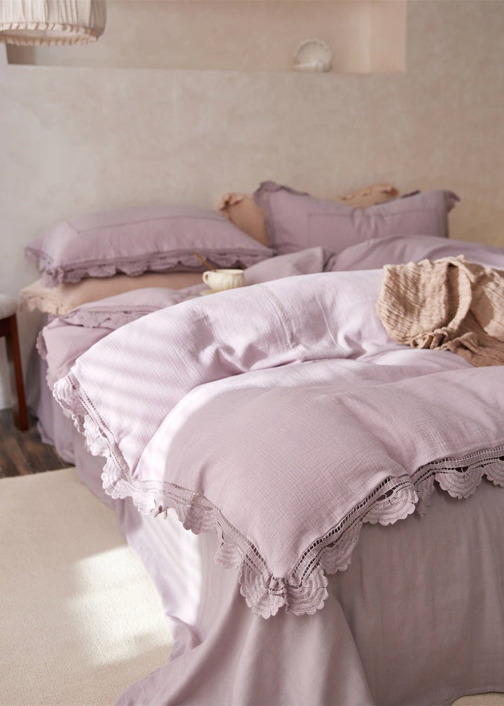 Isadora Lace Ruffle Double Gauze Bedding Set is now offered in a bundle, and all bundle sets come with a pre-included 10% to 20% discount! Enjoy savings on a complete set, including a duvet insert and pillow(s), along with our classic duvet cover, bed sheet, and pillowcase(s).