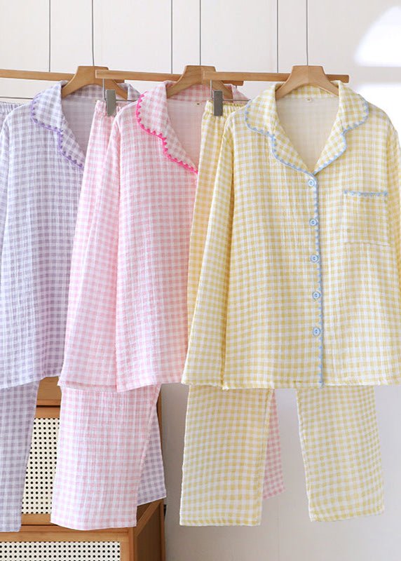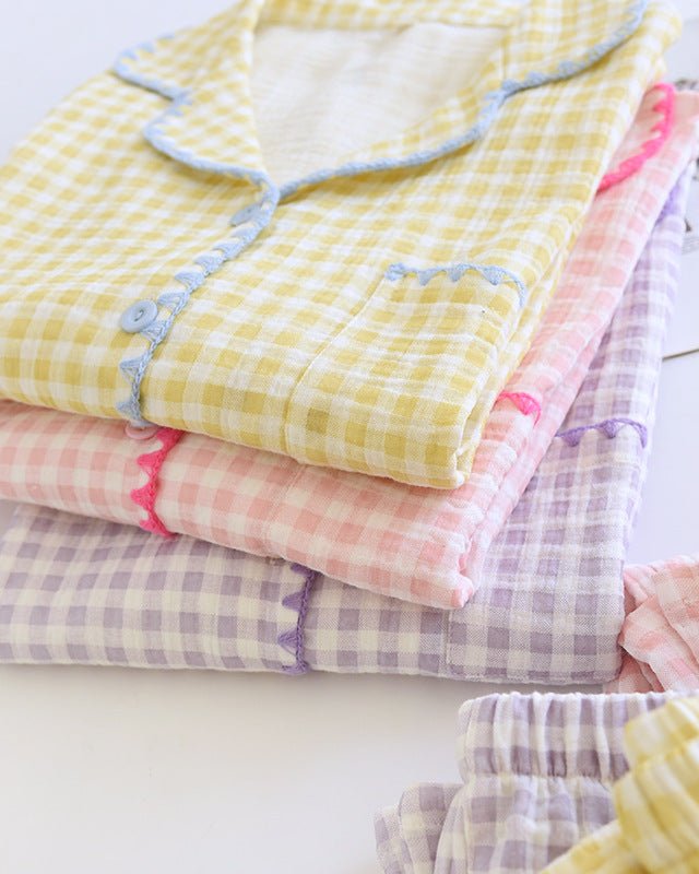 Gingham Cotton Pajama Set – Lightweight Long Sleeve Lounge Set with Ruffle Trim / Yellow