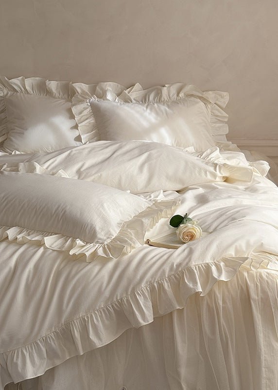 Indulge in the graceful charm of the Mila Lace Ruffle Pastel Bedding Set by Ever Lasting. Designed for those who adore delicate details, this luxurious set features flowing ruffles, intricate lace accents, and a palette of soft pastels that soothe the senses. Crafted from premium materials, it offers a lightweight yet lavish feel—perfect for creating a refined and restful retreat. Elegant, feminine, and effortlessly sophisticated, Mila turns your bed into a dreamy escape. Each duvet cover features corner ties and a concealed zipper to secure your duvet insert, ensuring lasting quality and easy maintenance.