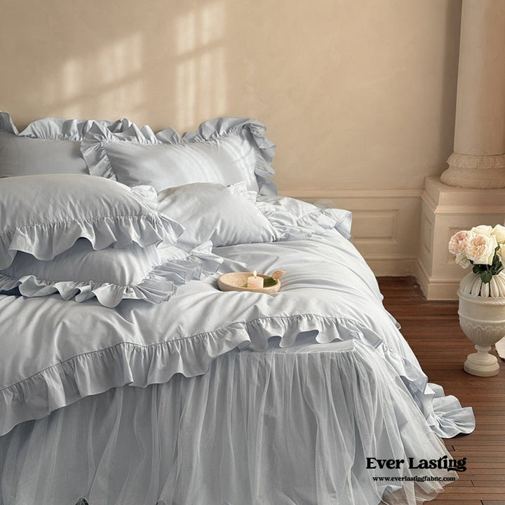 The Ever Lasting's Mila Lace Ruffle Pastel Bedding Set brings a sense of calm elegance to your bedroom. Soft pastel tones and airy fabric create a peaceful atmosphere, while lace-trimmed ruffles add a gentle romantic touch. Designed for those who find beauty in the quiet moments, this set wraps you in comfort and charm. Each duvet cover features corner ties and a concealed zipper to secure your duvet insert, ensuring lasting quality and easy maintenance.