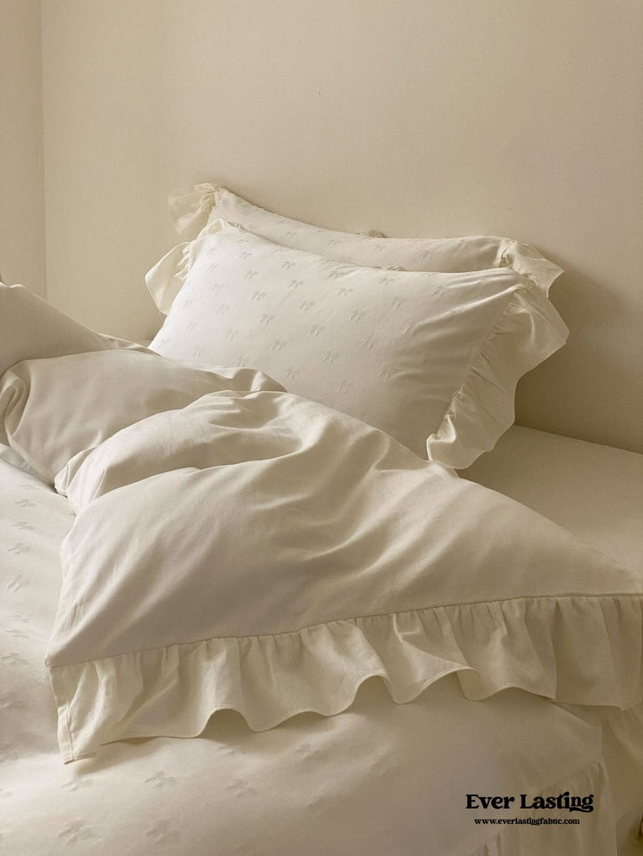 Create a luxurious sanctuary in your bedroom with Milena Ribbon Bow Ruffle Bedding Bundle by Ever Lasting. Made from 60-count long-staple cotton, this bundle offers both exceptional softness and durability for a peaceful night's sleep. The elegant jacquard weave adds texture and depth, while the delicate bowknot accents and subtle ruffle details bring a touch of French-inspired charm, perfect for those who appreciate a refined, romantic aesthetic. Each duvet cover comes with corner ties and a hidden zipper closure, ensuring a secure fit and long-lasting quality tailored specifically for you. Elevate your bedroom with this timeless and luxurious bedding bundle, perfect for creating a cozy and elegant atmosphere.