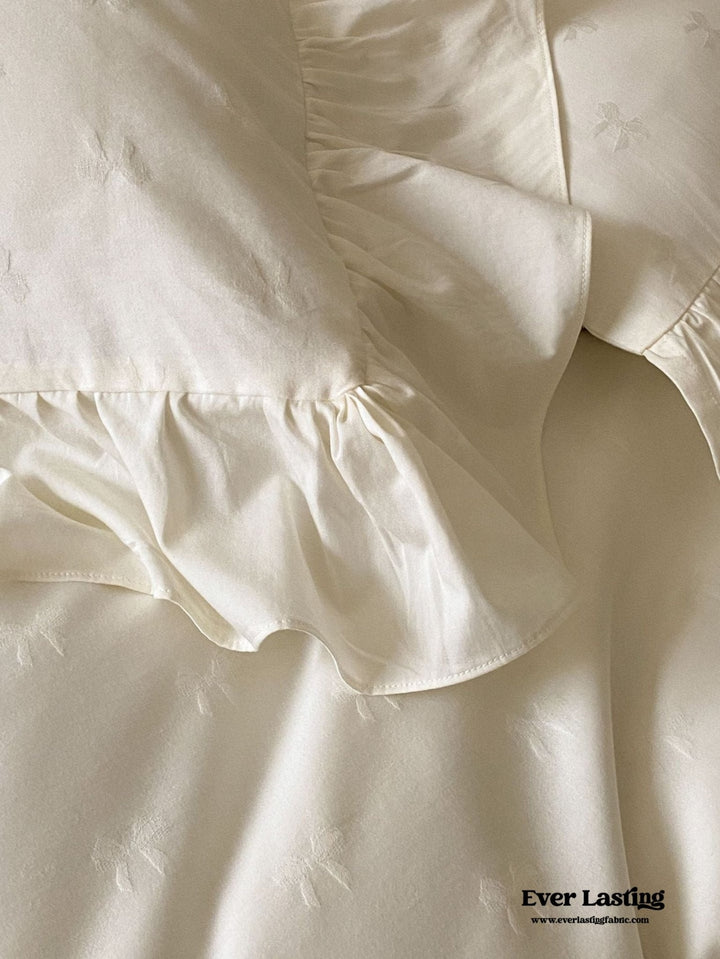 Transform your bedroom into a luxurious sanctuary with Ever Lasting's Milena Ribbon Bow Ruffle Bedding Set. Crafted from 60-count long-staple cotton, this bedding set combines exquisite softness with durability for a restful night's sleep. The elegant jacquard weave adds texture and depth, while the delicate bowknot accents and subtle ruffle details exude French-inspired charm, perfect for those who appreciate a refined, romantic aesthetic. Each duvet cover features corner ties and a hidden zipper closure to secure duvet inserts, ensuring a perfect fit and lasting quality tailored just for you. Ideal for creating an elegant, cozy ambiance, this bedding set brings a touch of luxury and timeless beauty to any bedroom.