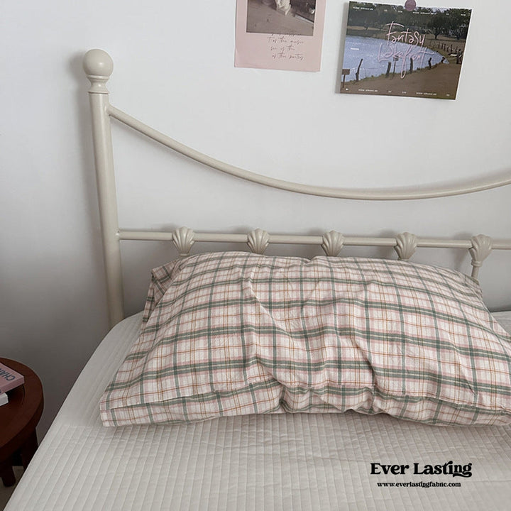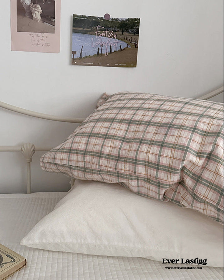 Muted Blush Cotton Pillowcase / Pink & Green Plaid