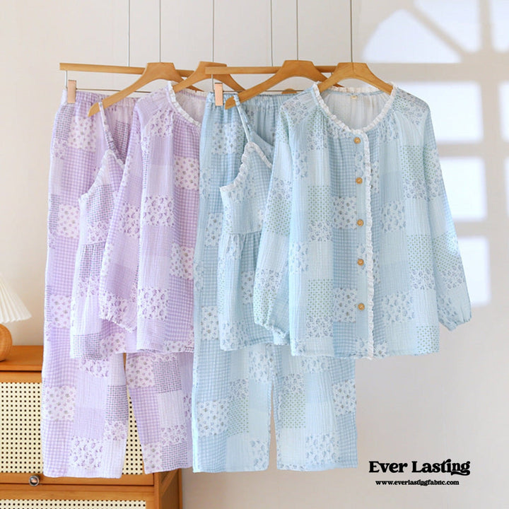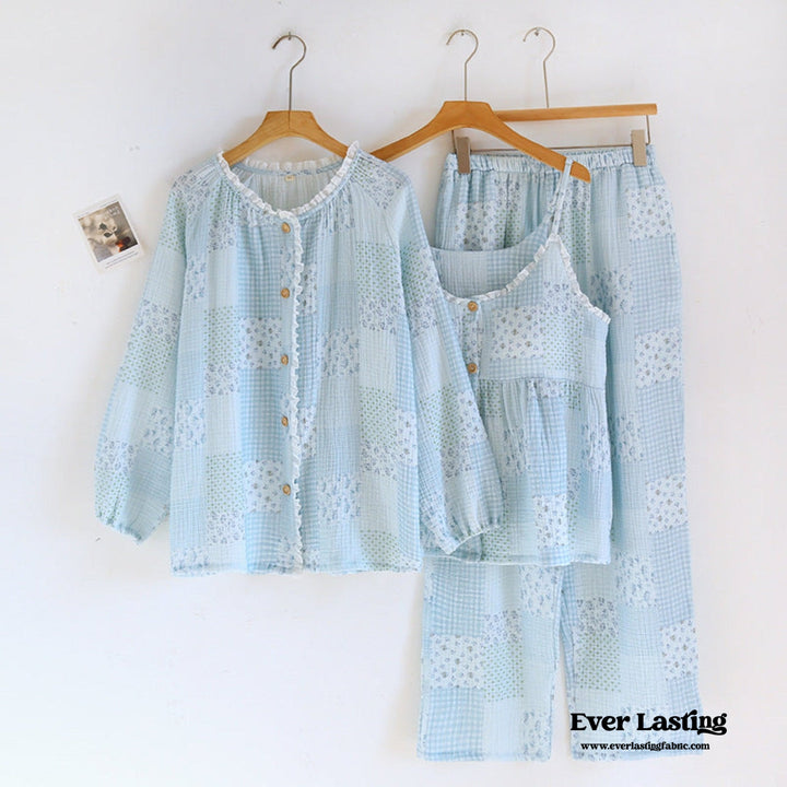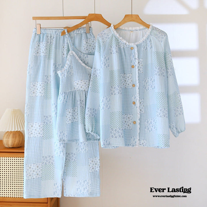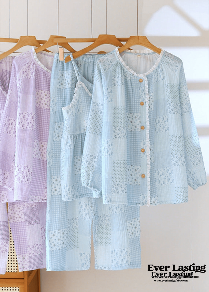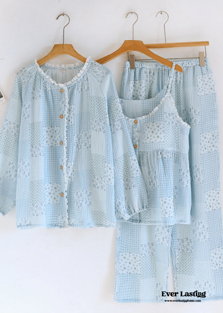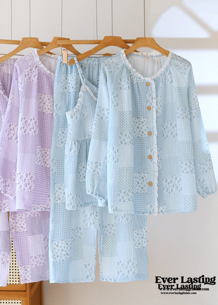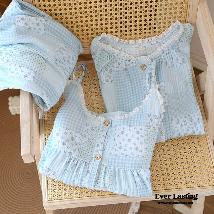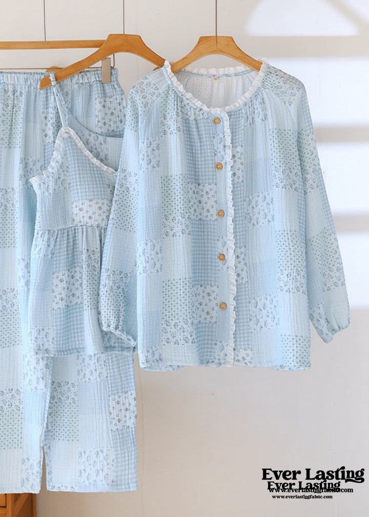 Patchwork Floral Cardigan Pajama Set / Blue