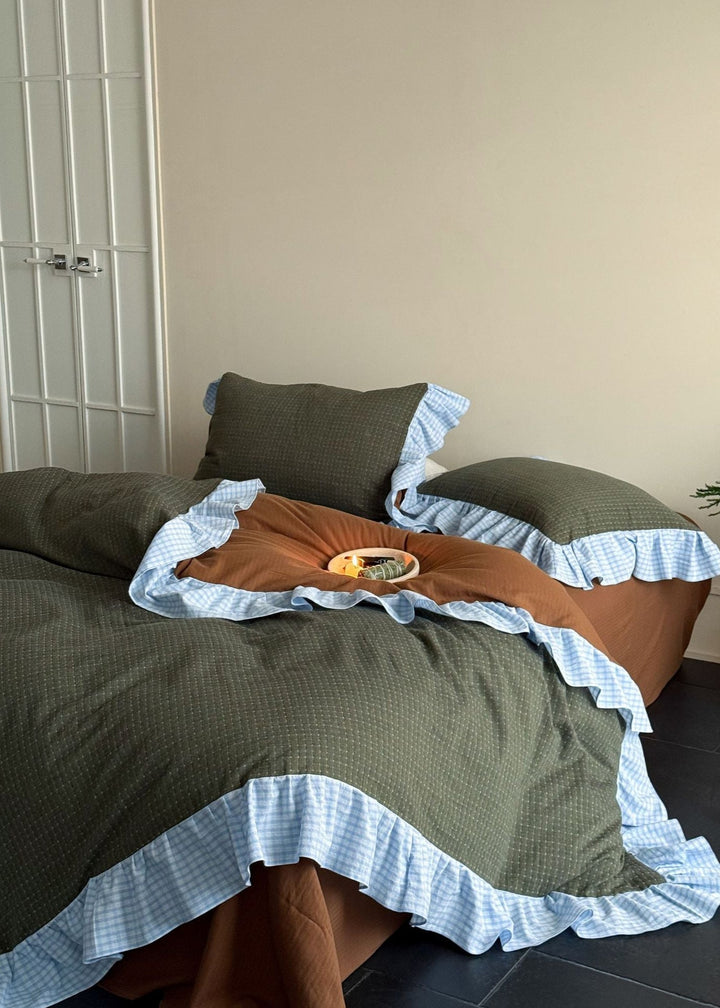 Bring timeless charm to your bedroom with this elegant bedding set. The Ever Lasting's Sadie Gingham Lace Ruffle Bedding Set features classic gingham patterns paired with delicate lace ruffles for a cozy, stylish look. The duvet cover includes corner ties and a hidden zipper, keeping your insert securely in place. Elevate your space with premium comfort and vintage flair!