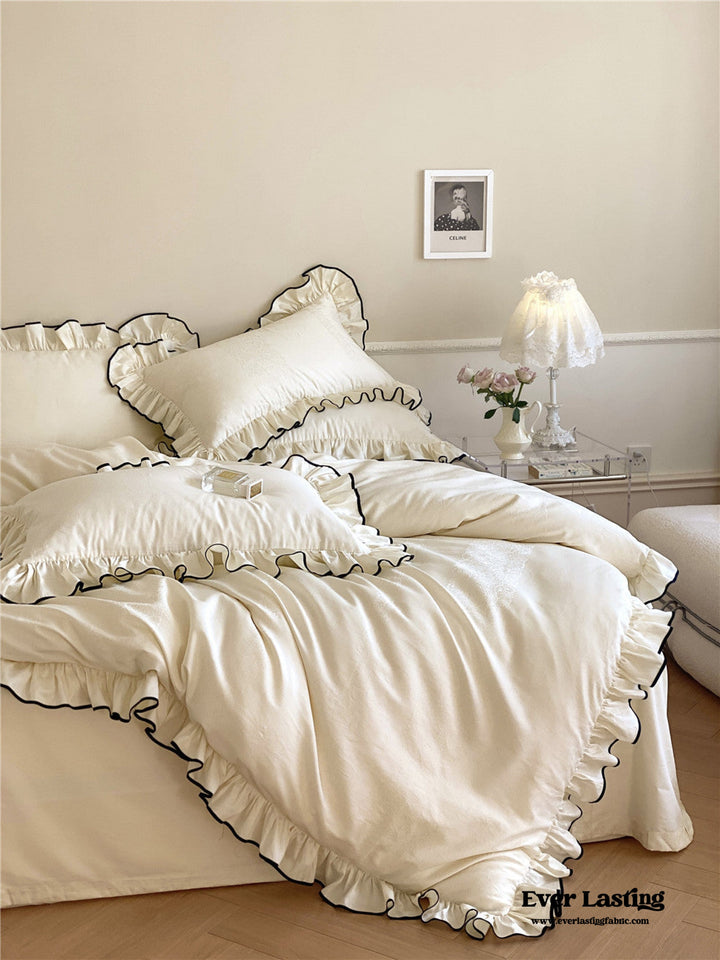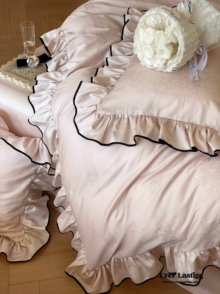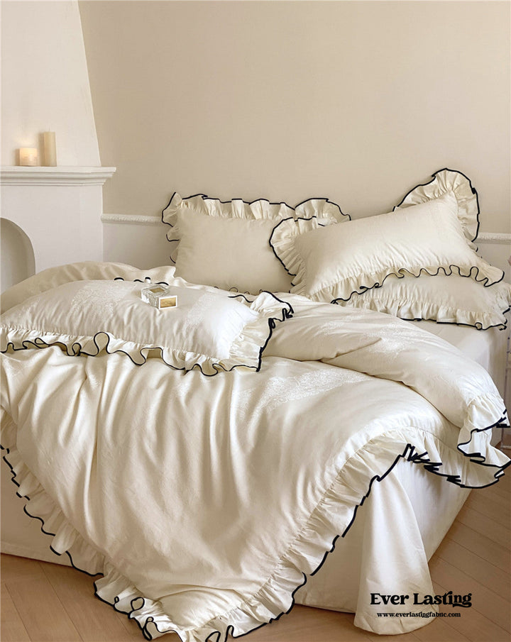 Indulge in the captivating soft coquette aesthetic of our Silky Ruffle Pillowcases, designed to enhance your bedroom with elegance. The fabric is meticulously crafted with an incredibly soft and smooth texture, accentuated by its flowing jacquard weave. Made from luxurious 100S Australian cotton fabric, it guarantees breathability, comfort, and durability while providing a gentle touch against your skin. The pillowcases' design boasts a refined wide black stripe and a beautiful ruffled hem, effortlessly adding a touch of sophistication to your bedroom decor. Immerse yourself in the perfect blend of opulence, style, and sweetness with our Silky Ruffle Pillowcases.