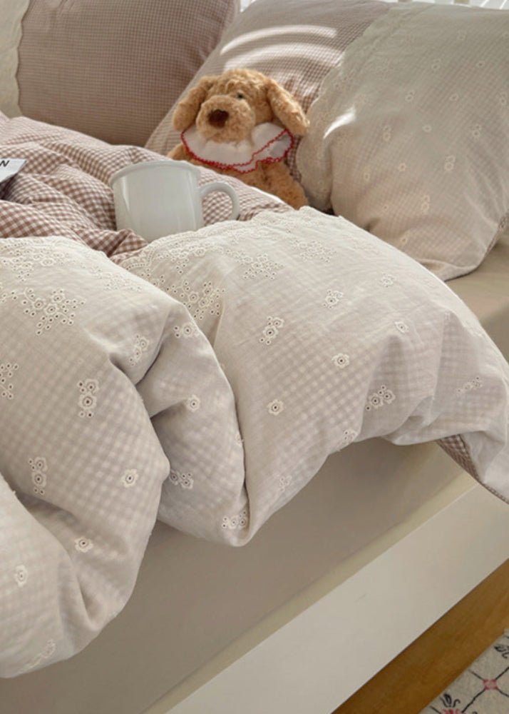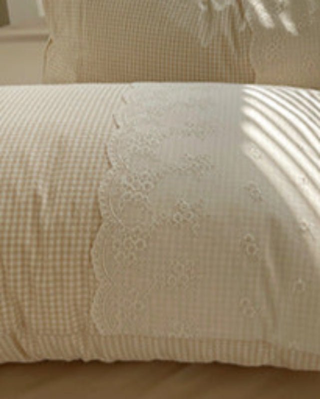 Bring soft cottage charm into your bedroom with the Sophia Gingham Lace Washed Cotton Bedding Set by Ever Lasting. Featuring a classic gingham design and delicate lace accents, this set blends vintage elegance with cozy comfort. Crafted from breathable washed cotton, it offers a naturally soft, relaxed feel perfect for year-round use. Thoughtful details like corner ties and a hidden zipper keep your duvet securely in place, ensuring both beauty and function. Sophia turns your bedroom into a graceful and restful escape—simple, stylish, and effortlessly inviting.