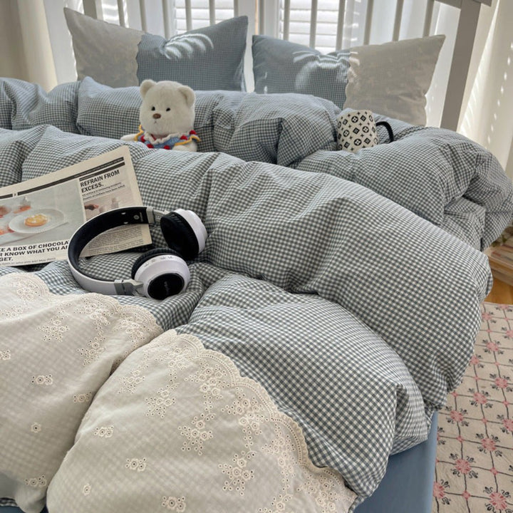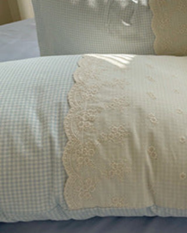 Sophia Gingham Lace Washed Cotton Bedding Set / Ocean Blue