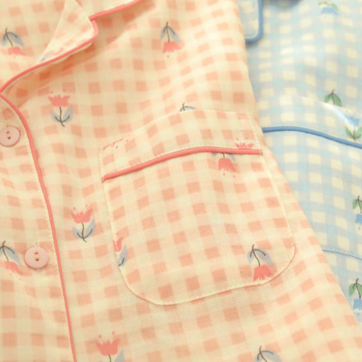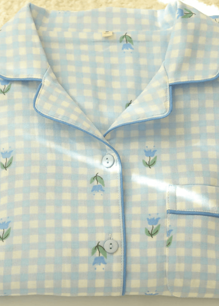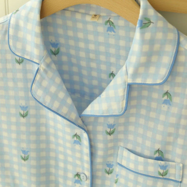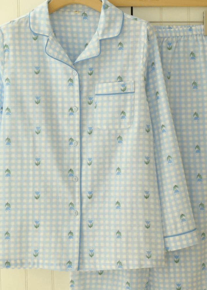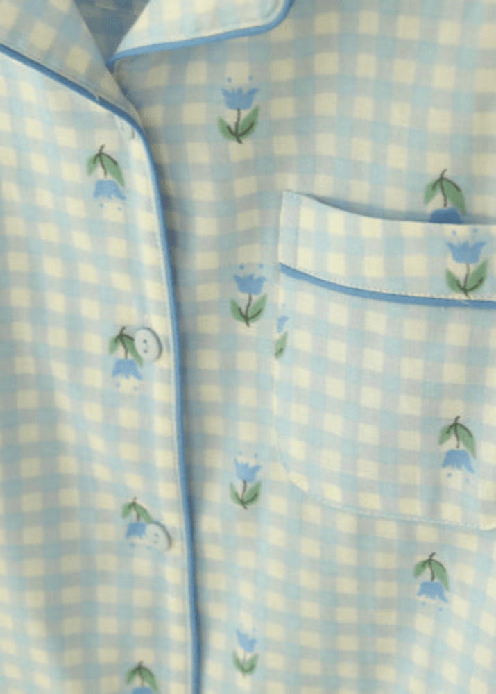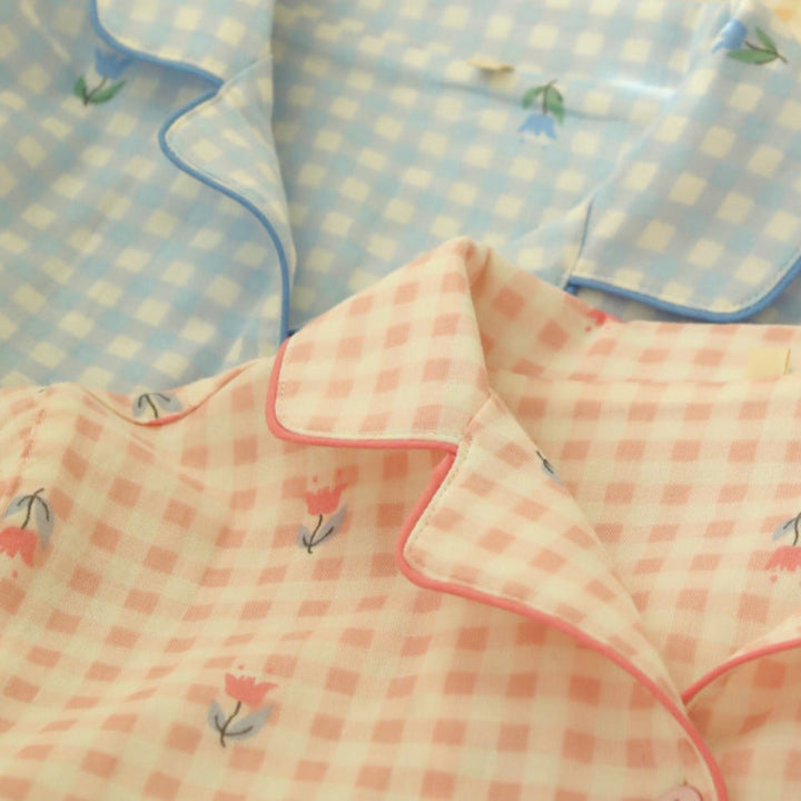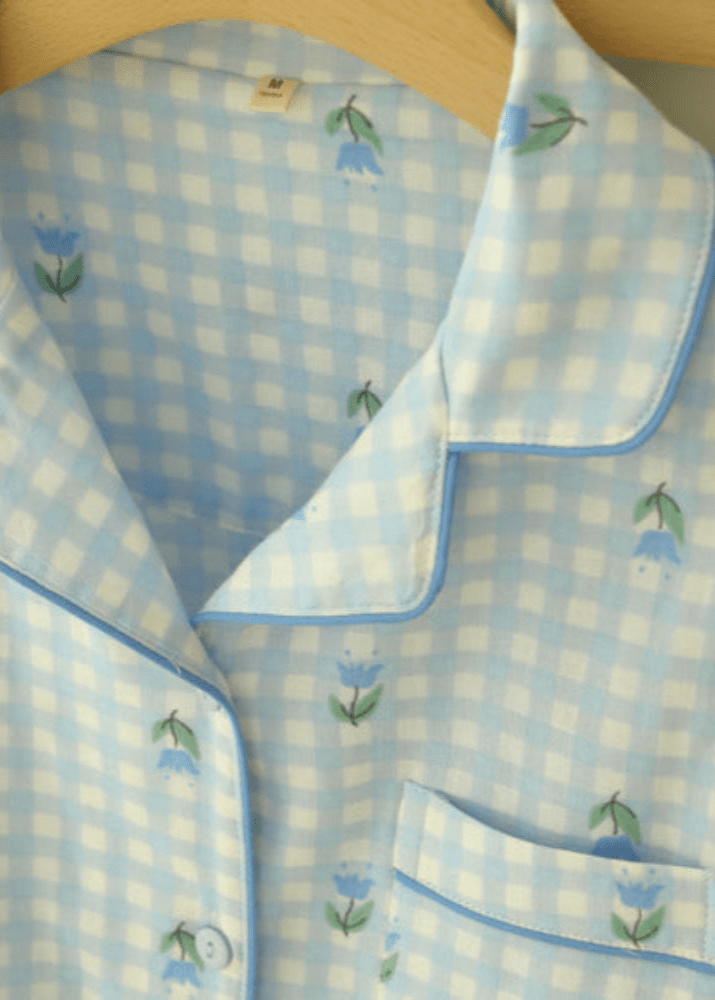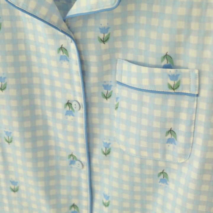 Fresh, floral, and made for slow mornings — the Ever Lasting's Clara Tulip Gingham Pajama Set brings soft charm and effortless comfort to your daily wind-down. Featuring a light blue gingham base scattered with tiny tulip prints, this set feels like spring in fabric form. Made from breathable double-gauze cotton, it’s airy, lightweight, and gentle on sensitive skin. Finished with contrast piping, a button-down top, and elastic-waist bottoms, Clara blends vintage sleepwear silhouettes with a youthful coquette twist. Whether you're curled up with a book or sipping tea in bed, Clara is your perfect companion for cozy nights and soft starts.