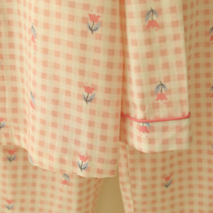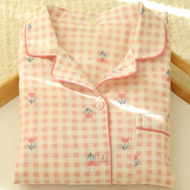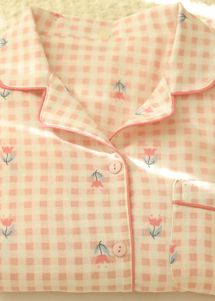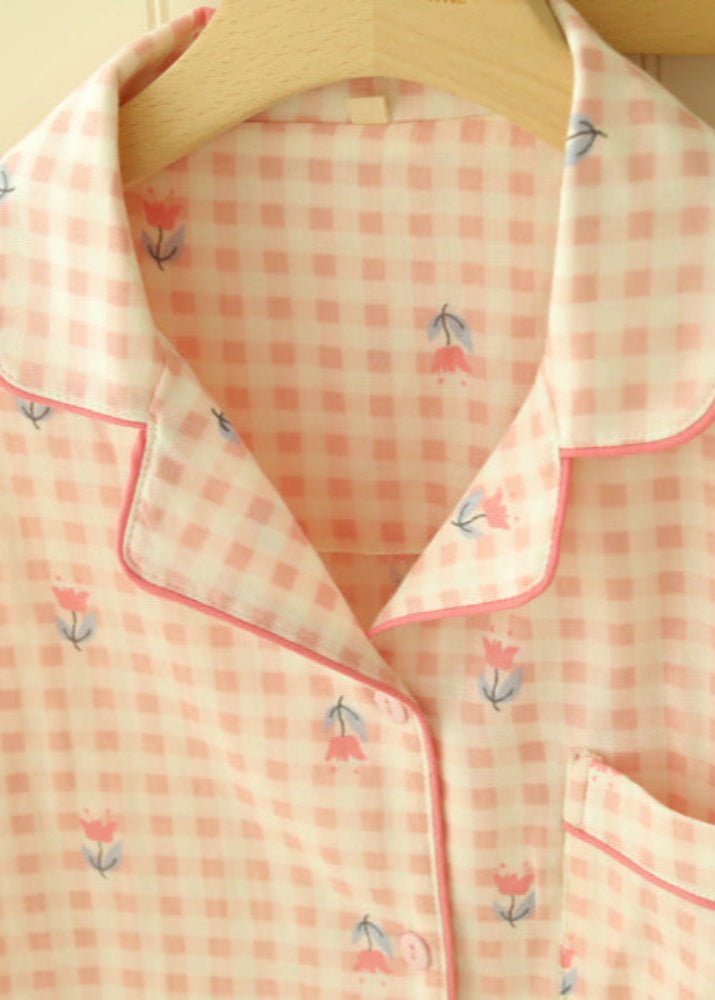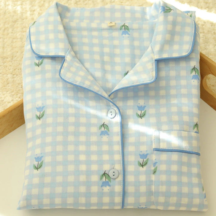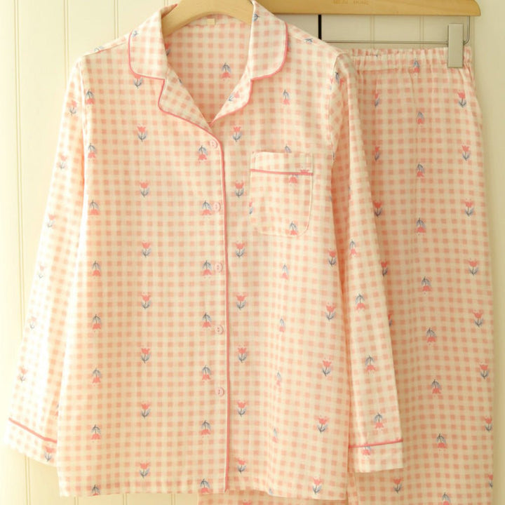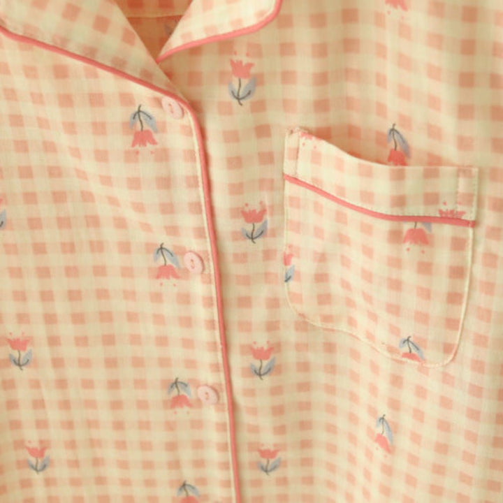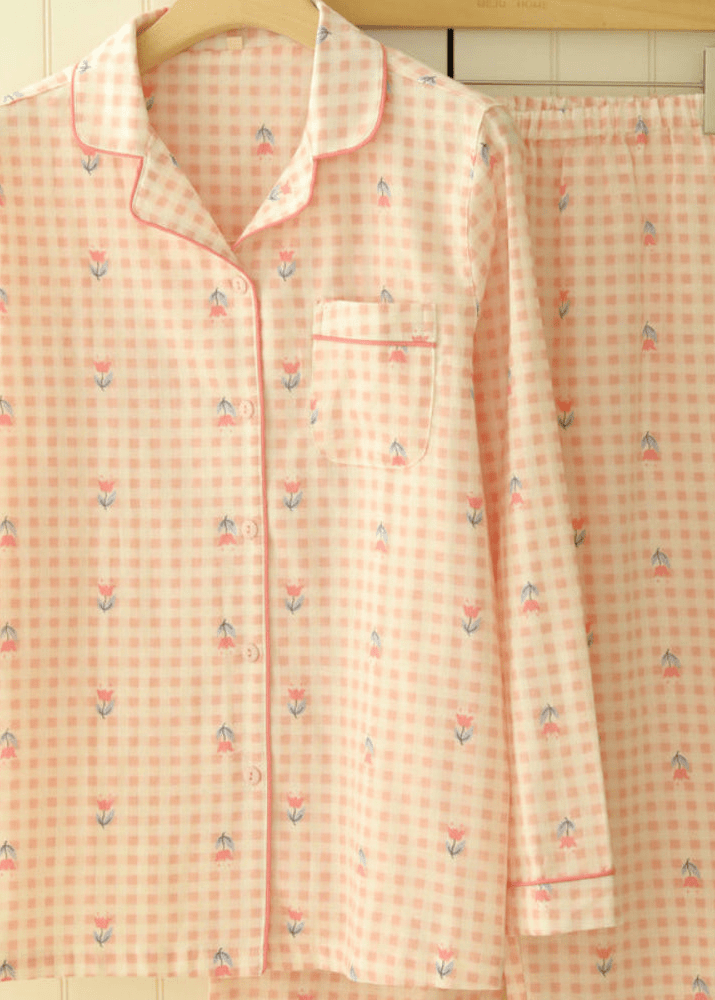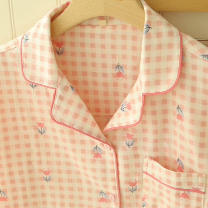 Fresh, floral, and made for slow mornings — the Ever Lasting's Clara Tulip Gingham Pajama Set brings soft charm and effortless comfort to your daily wind-down. Featuring a light blue gingham base scattered with tiny tulip prints, this set feels like spring in fabric form. Made from breathable double-gauze cotton, it’s airy, lightweight, and gentle on sensitive skin. Finished with contrast piping, a button-down top, and elastic-waist bottoms, Clara blends vintage sleepwear silhouettes with a youthful coquette twist. Whether you're curled up with a book or sipping tea in bed, Clara is your perfect companion for cozy nights and soft starts.